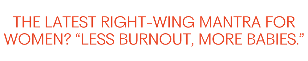 Like the conservative movement more broadly, the organization wants young women to believe this is all being done for their benefit: that work is soulless and unfulfilling, that feminism has made women miserable, and that the real path to happiness is being a stay-at-home mom. The latest right-wing mantra for women? “Less burnout, more babies.”